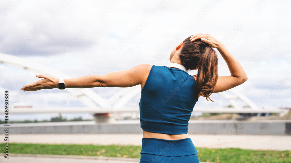 Rear view of a fit woman performing a warm-up stretch outdoors in urban environment. #1948930389