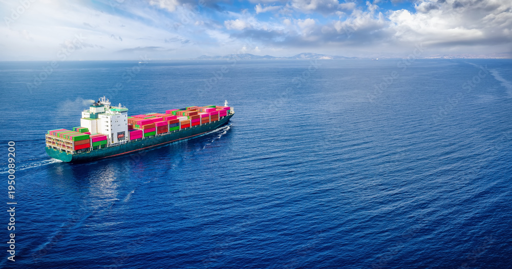 Rear view of a loaded container ship sailing over the ocean for industry, shipping and cargo with copy space #1950089200
