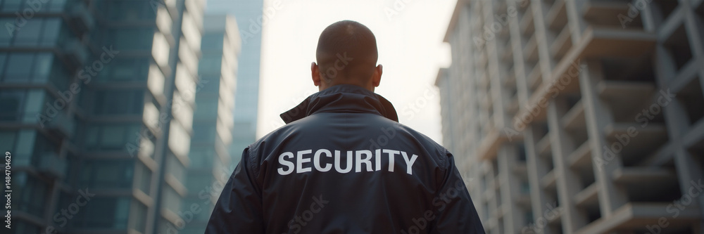 Professional security guard patrolling modern urban district for corporate safety and property protection #1484704629