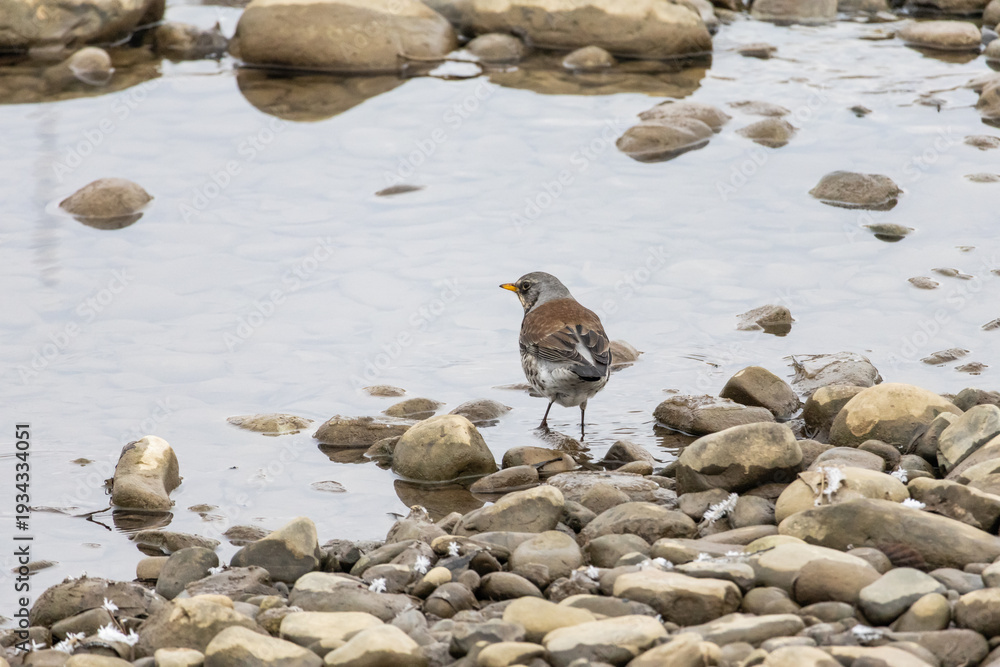 Rear view of a thrush stepping toward open water between smooth rocks. The bird glances back as it leaves the stony shore and continues its foraging route downstream. #1934334051