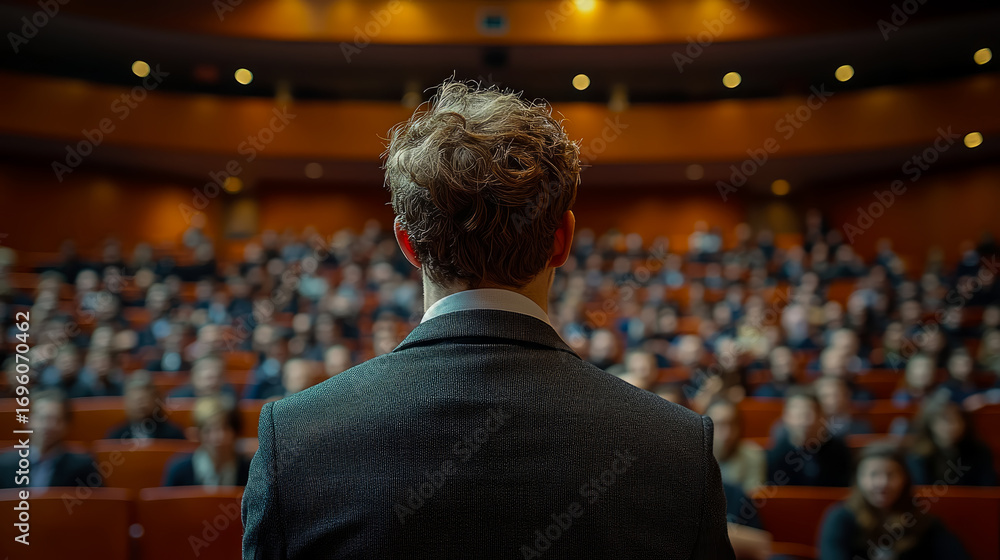 Rear view of curly-haired man in dark suit, confidently addressing vast, blurred audience seated in auditorium with warm lighting #1696070462