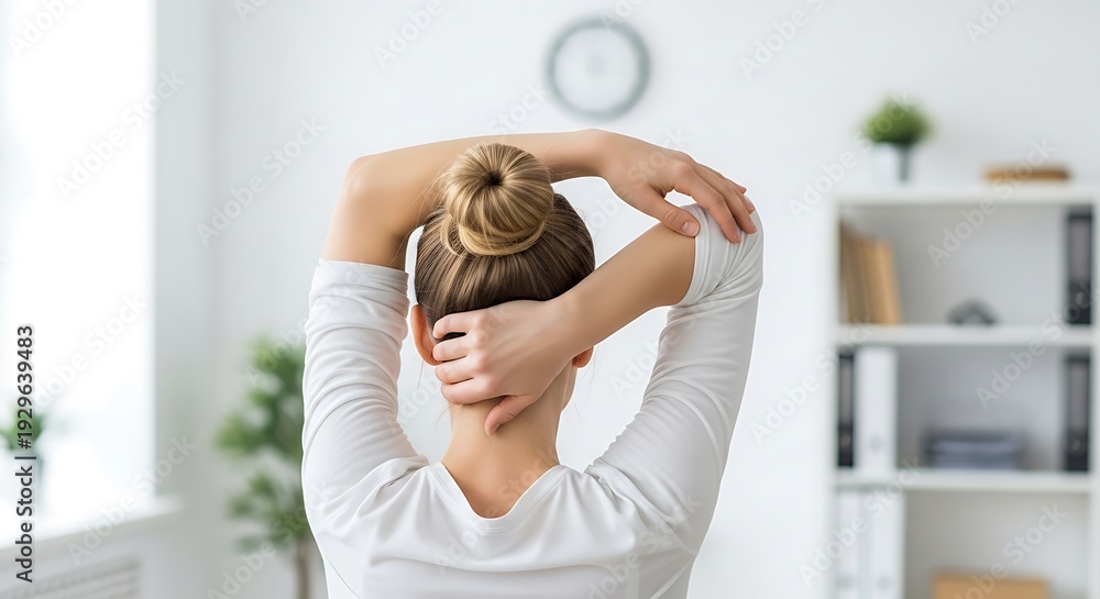 Rear view of woman in white shirt stretching arms behind head, in bright office #1929639483