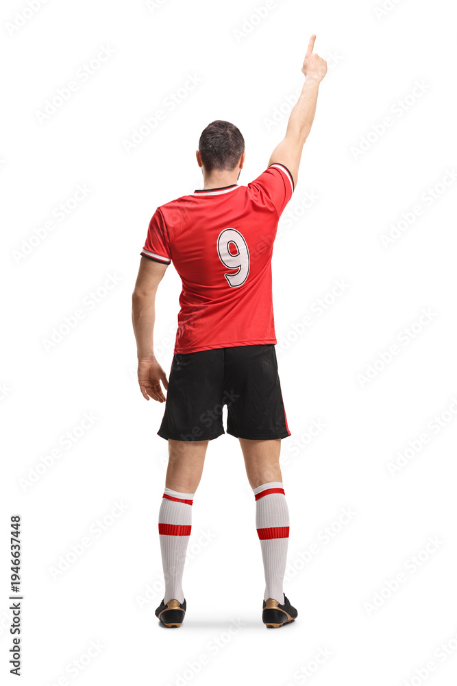 Rear view shot of a football player in a red jersey standing and pointing #1946637448