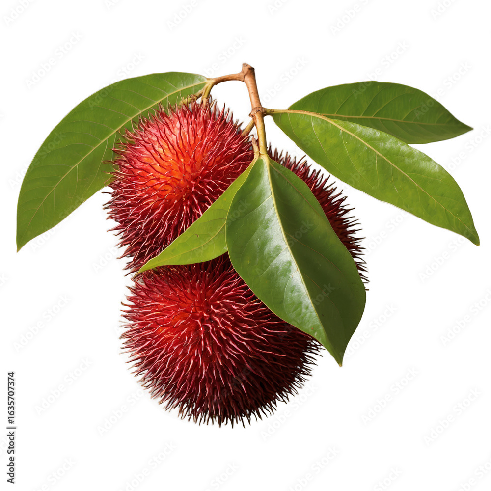 Red Annatto Fruits on a Branch with Green Leaves, Tropical Fruit Still Life. #1635707374