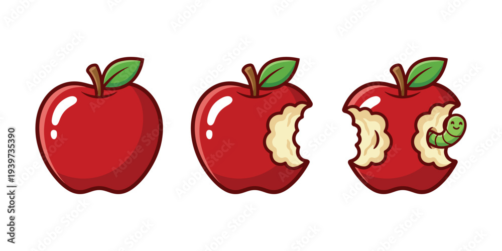 Red Apple with Bite and Worm – Cute Cartoon Apple Eating Sequence Illustration Set #1939735390