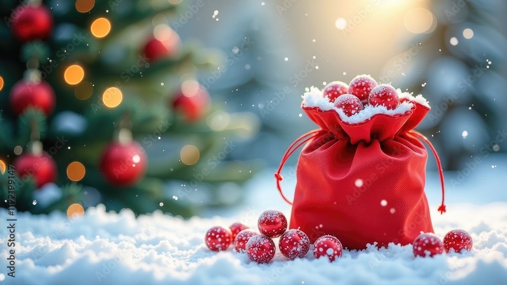 Red bag with gifts against the backdrop of a Christmas tree on a winter holiday background. #1122199147