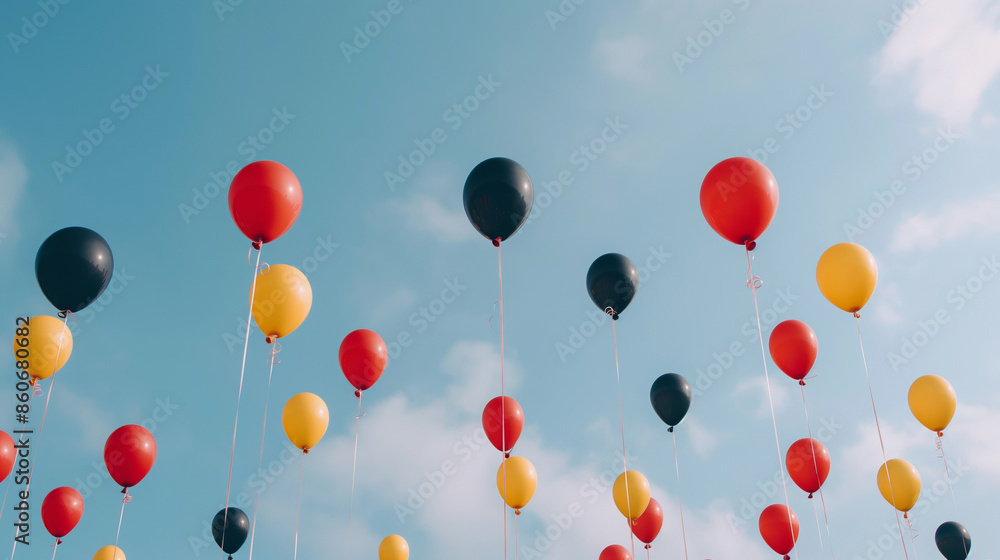 Red, black, and yellow balloons float in the blue sky, symbolizing German unity. Celebrating Unity Day with balloons soaring high, embodying freedom and national pride #860680682