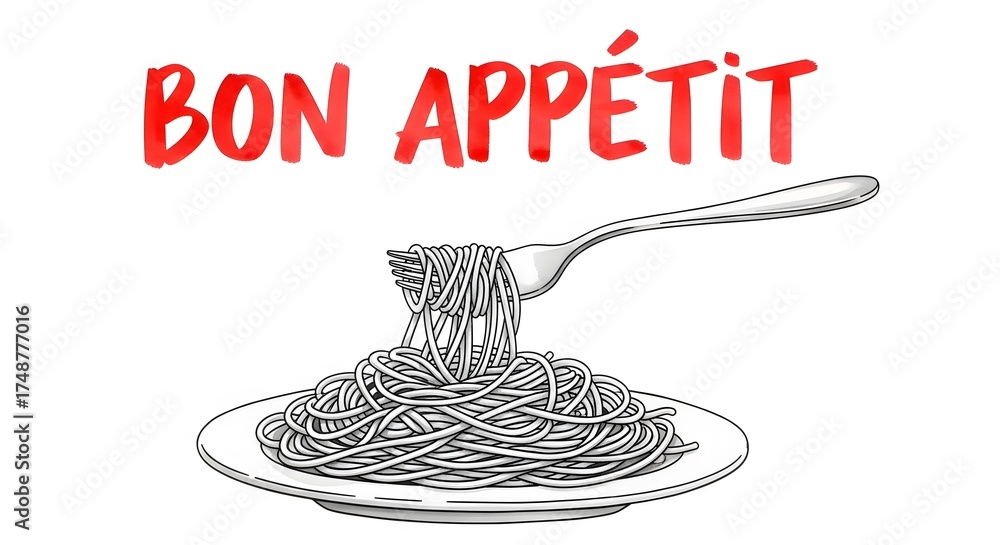 Red Bon Appetit text above fork with spaghetti on plate isolated on white background #1748777016