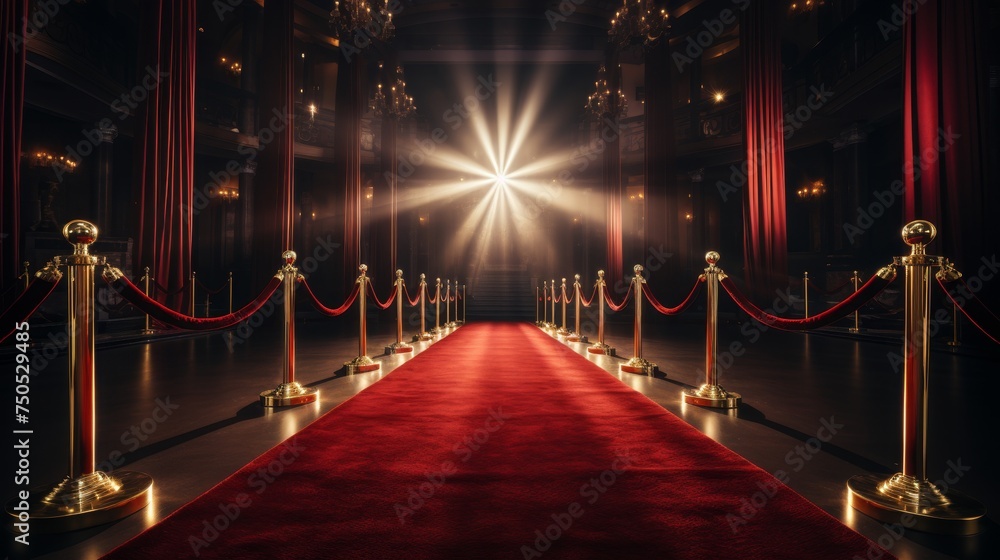 Red carpet with barriers and red rope, Entertainment concept. #750529485