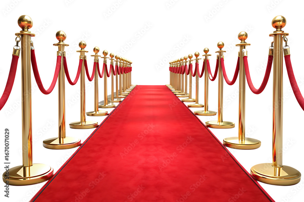 Red Carpet with Golden Stanchions and Velvet Ropes – Isolated on White or Transparent Background, PNG, AI Generated #1670071029