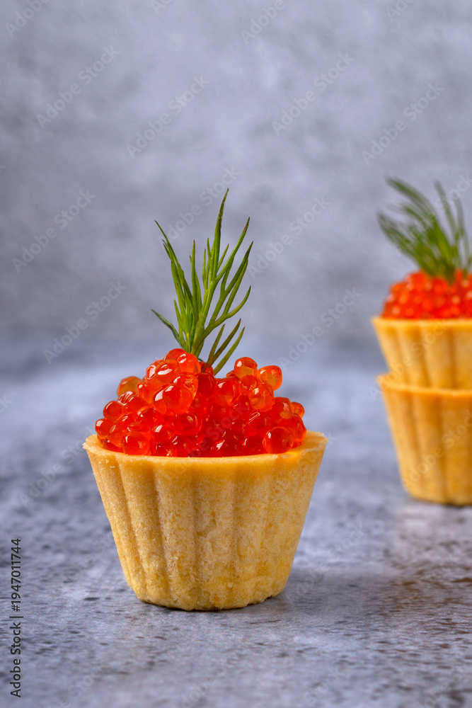 Red caviar tartlet decorated with dill appetizer against the gray background. Close-up #1947011744