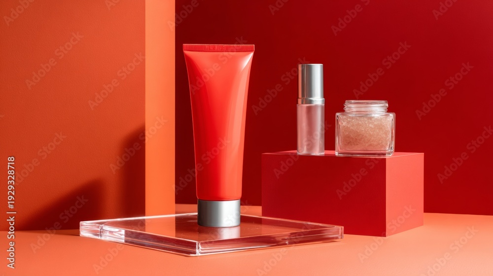 Red cosmetic tube and jar on bold geometric podium #1929328718