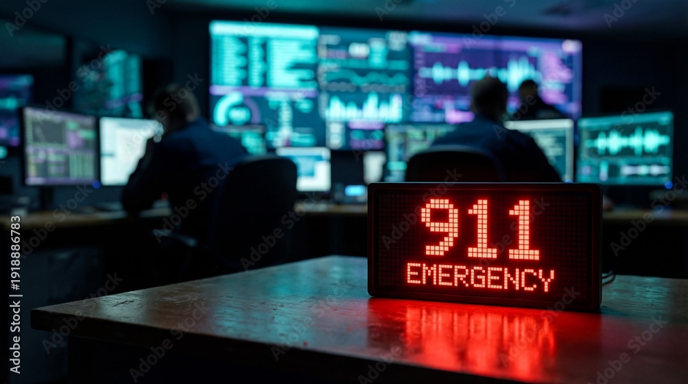 Red digital display showing 911 emergency alert rests on a desk within a dimly lit control room environment. #1918886783