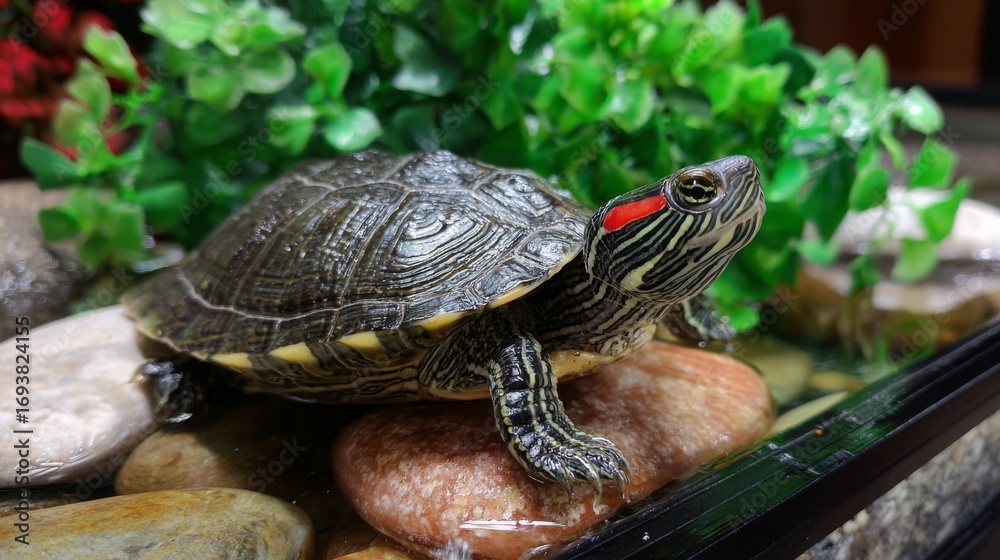 Red-eared slider turtle basking on rocks in a lush aquarium environment #1693824155