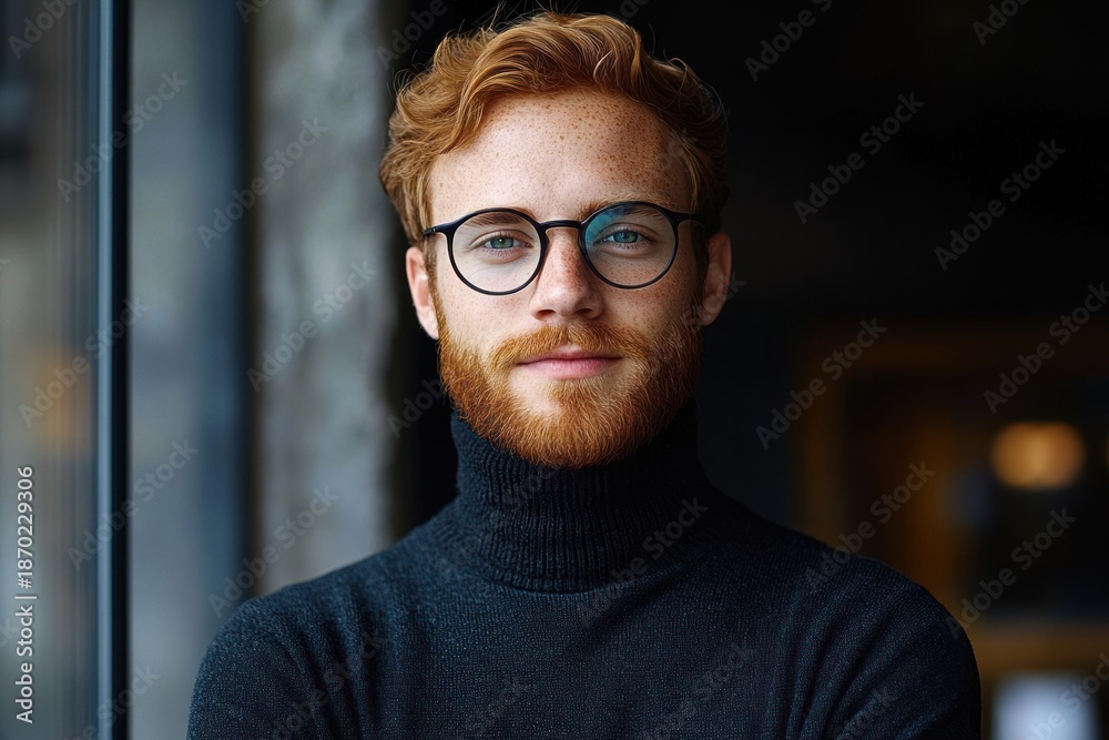 red-haired person in black turtleneck standing by a window in soft natural light, moody interior portrait conveying quiet confidence and contemplative calm #1870229306