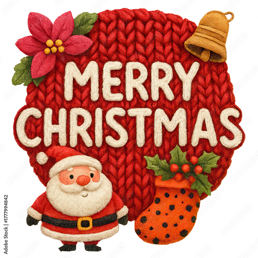 Red knitted heart with "MERRY CHRISTMAS" text, featuring Santa, bell, stocking, poinsettia, and holly #1777994842