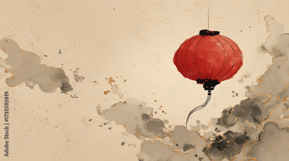 Red Lantern Hanging with Gold Ink Splatter. Minimalist Design for Lunar New Year. #1733595819