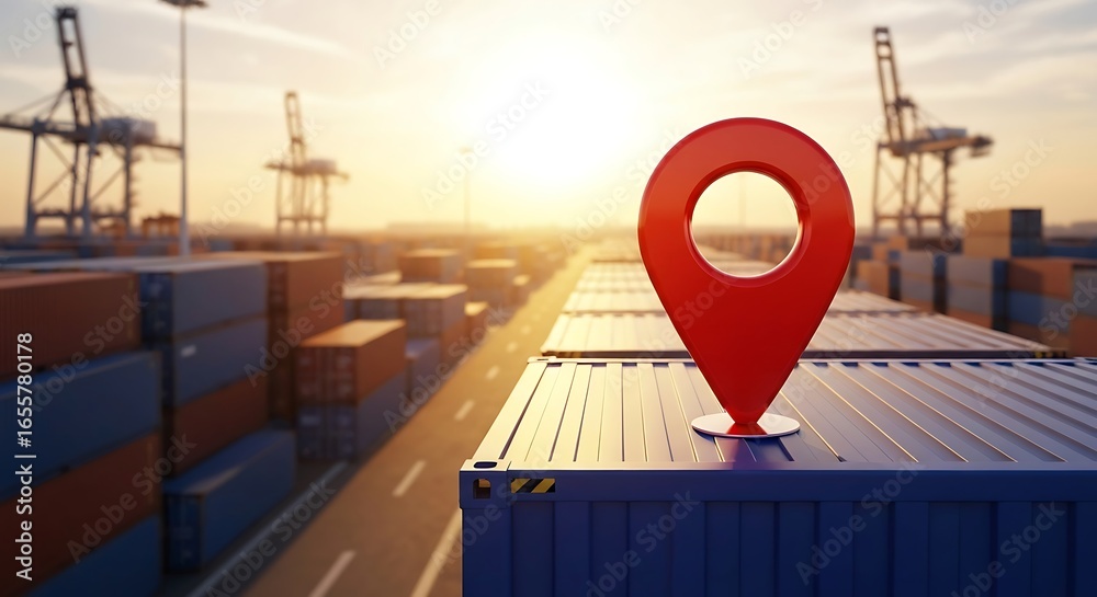 Red location marker on shipping containers at port #1655780178
