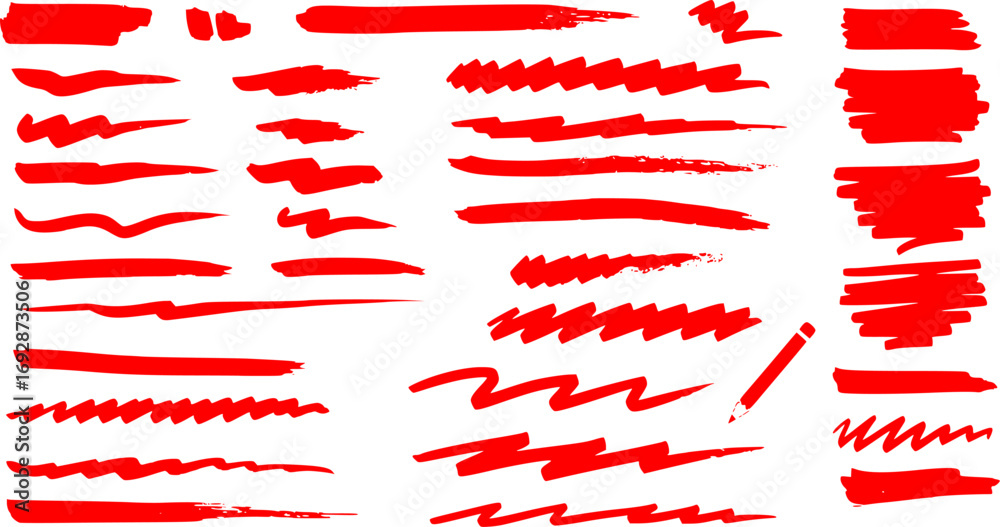 Red marker underline brush stroke set. Marker red pen highlights squiggle stroke. Vector swoosh brush handwritten underline set for accent, pencil emphasis element. Vector illustration #1692873506