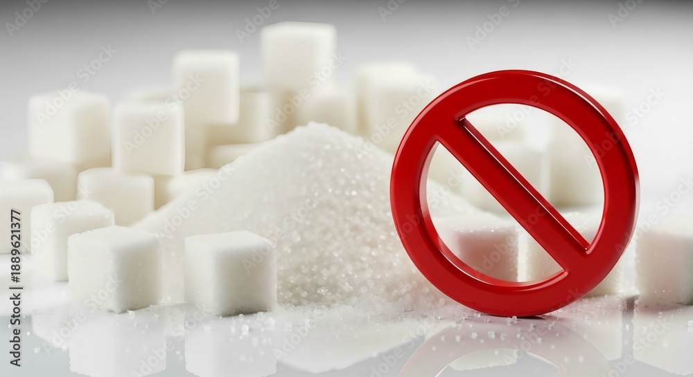 Red no entry sign warns against white sugar cubes and granulated sugar #1889621377