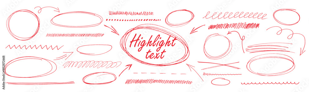 Red pen strokes forming round circle underline shapes with hand drawn doodle arrow elements creating vector set kit bundle for highlight text using scribble oval lines in playful layout. #1852872668