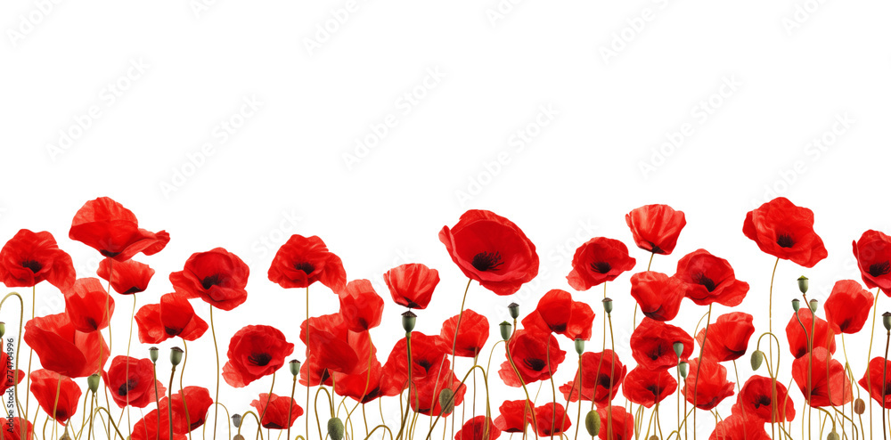 Red poppy flowers field closeup border for cards, invitation etc. Isolated on a transparent background. #774704996