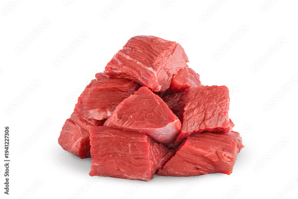 red raw beef meat cut into pieces in a small pile - isolate on a white background, ingredient dose measure to add to recipes when cooking according to recipes. #1941227306