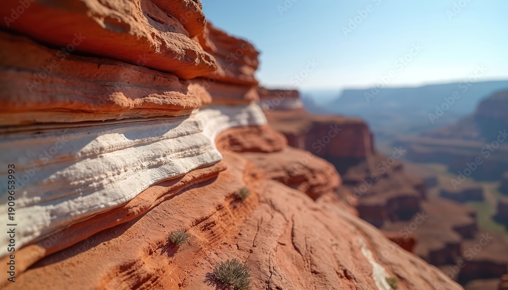 Red rock formations display clear horizontal layers of sediment and stone. The sunlit cliff face shows distinct white and orange strata. Distant canyons and blue sky form the background. #1909653993