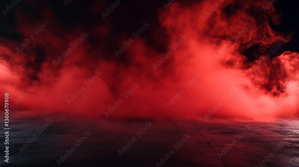 Red smoke fills dark room. Abstract smoke effect against black background. Concrete floor. Empty scene. Ideal for product presentation or studio display. Dramatic and mysterious atmosphere. #1360670908