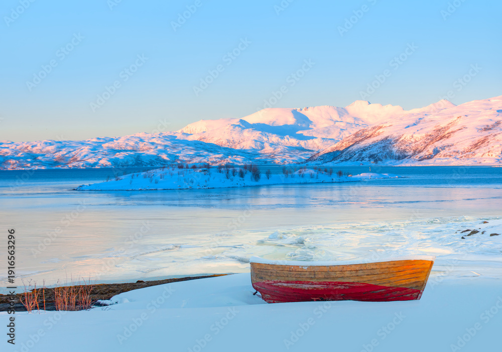 Red wooden boat covered with layers of snow - Beautiful winter landscape with snow covered red house - Tromso, Norway #1916563296