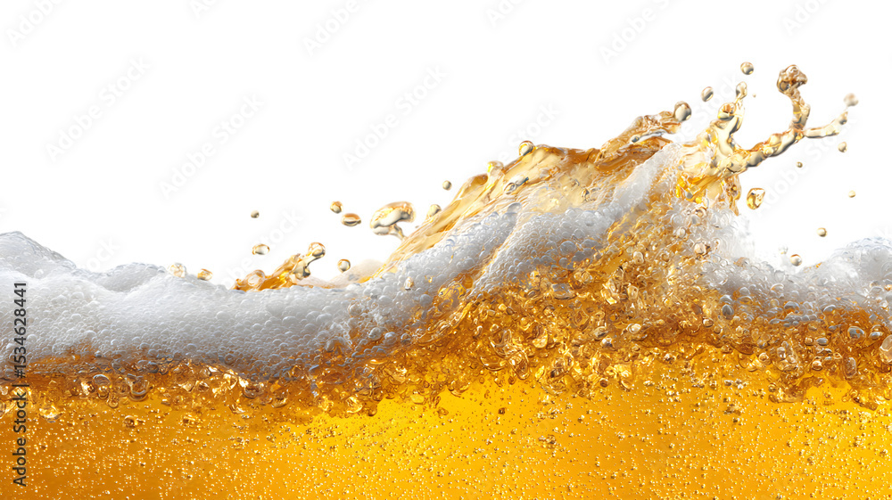 Refreshing golden beer splashing with bubbly foam and drops against a isolated on white transparent background representing celebration and enjoyment #1534628441
