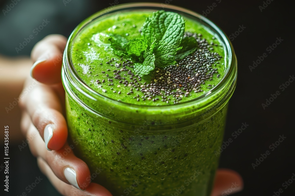 Refreshing green smoothie in hand closeup shot healthy drink indoor setting vibrant colors wellness concept #1154356815