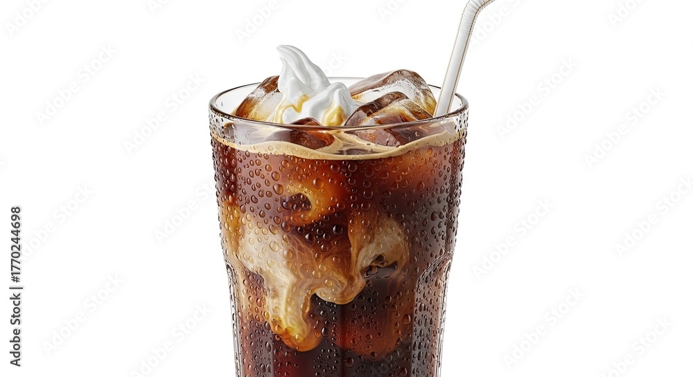 Refreshing iced coffee with creamy swirls and whipped cream topping, perfect for a hot summer day refreshment or cafe menu feature #1770244698