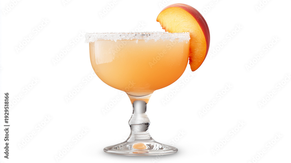 Refreshing peach margarita cocktail with a salt rim and fresh peach slice, perfect for a summer travel lifestyle. #1929518166