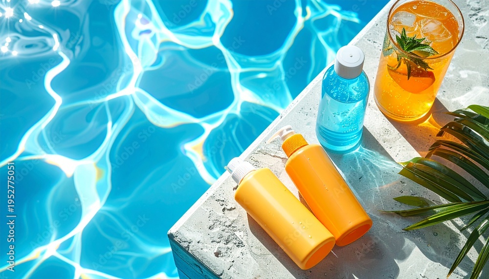 Refreshing poolside scene featuring sunscreen and a beverage, capturing the essence of summer relaxation by the pool #1952775051
