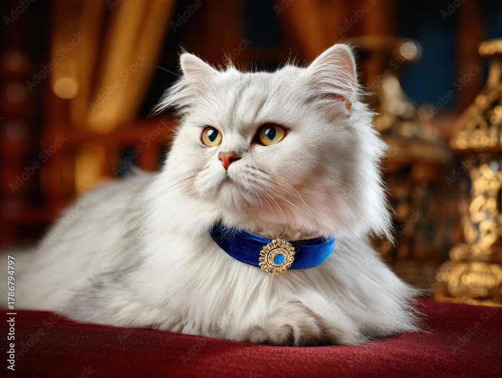 Regal Persian cat with luxurious coat and striking gaze rests elegantly on plush surface, adorned with royal blue collar #1786794797