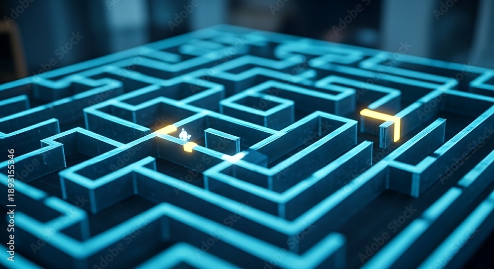 Reinforcement learning AI concept. A holographic light point (AI) learns to solve a maze through trial and error, with the correct path lighting up. #1893155346