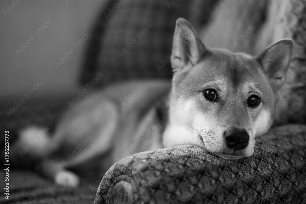 Relaxed Shiba Inu Resting on an Armchair in Black and White #1782237773
