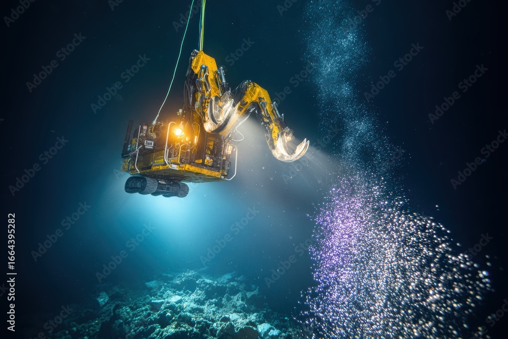 Remotely operated vehicle gathers polymetallic nodules during underwater mining in deep sea exploration #1664395282