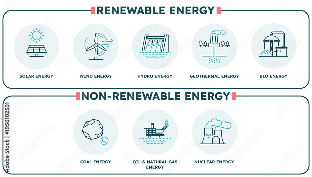 Renewable and non-renewable energy comparison infographic. Editable thin line icons including solar, wind, hydro, geothermal, biomass, coal, oil, gas, nuclear. Vector illustration. #1950102501