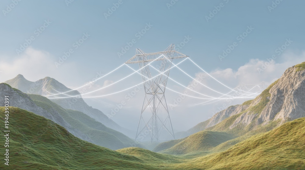 Renewable Energy Landscape with Power Lines and Mountains under Bright Sky and Fluffy Clouds for Eco-Friendly Projects #1946390391