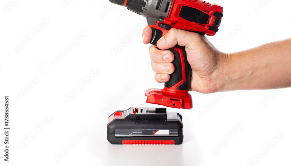 Replacing the battery in a new drill screwdriver on a white background, battery charge and capacity, close-up. Copy space for text #1738554531
