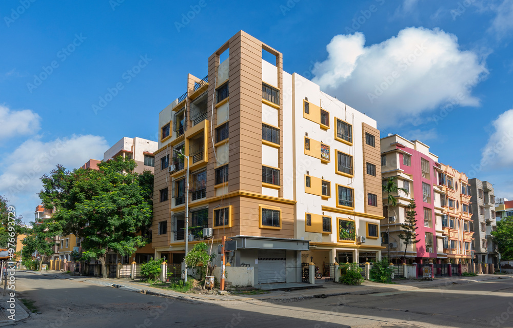 Residential multi-storey apartment buildings with city road at Rajarhat area of Kolkata, India. #976693729