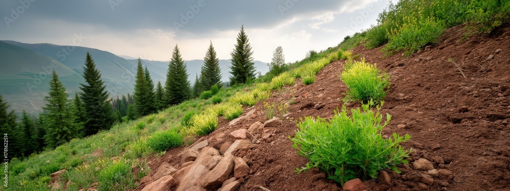 Restored hillside with terraced native plantings, Eco revival #1781622514