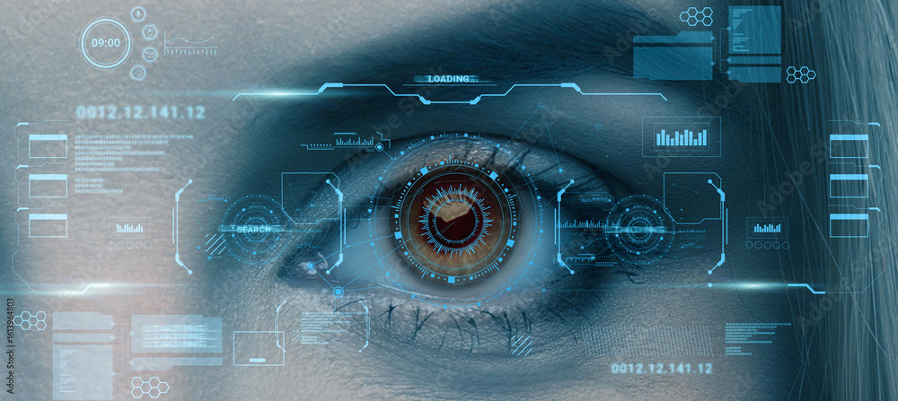 Retina scan of female eye, collage with futuristic data on virtual screen, panorama. User biometrical identification system, access control, data protection, modern security technology #1613964803
