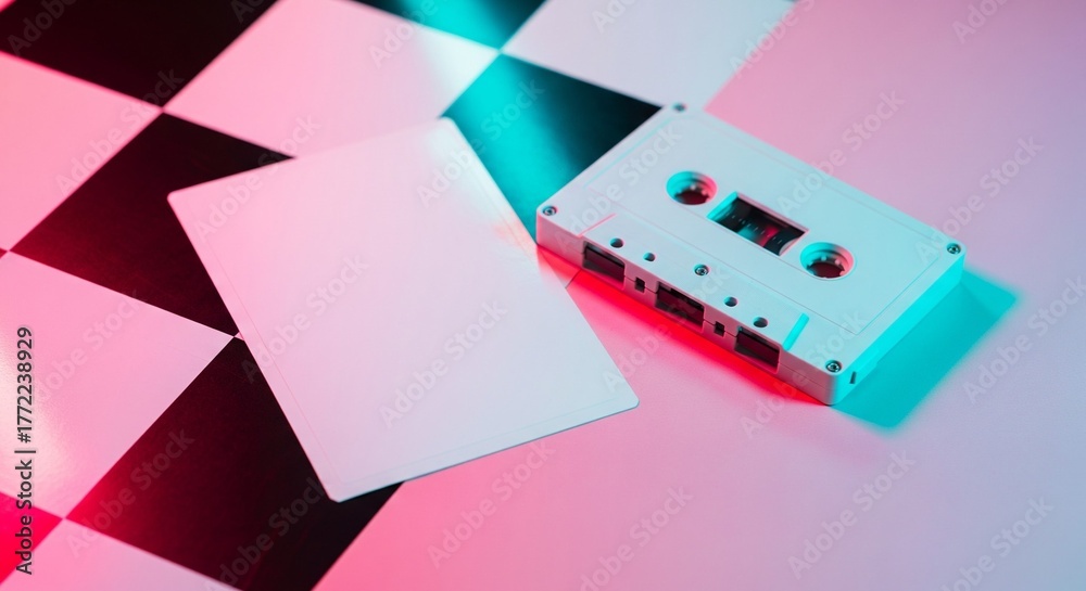 Retro Cassette Tape and Blank Card on Checkerboard Background with Neon Lighting #1772238929