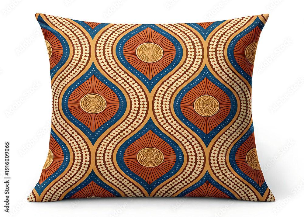 Retro geometric cushion fabric in blue and orange, close-up detail #1916009065