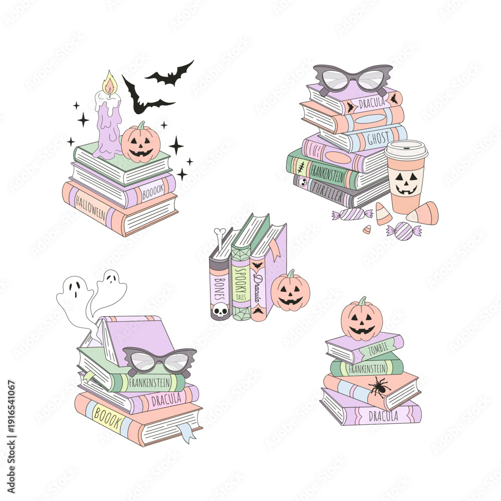 Retro Halloween Stacks of Spooky Books Clipart Set. Vintage Bookish Aesthetic Stickers for Journaling, Scrapbooking, Digital Planners and Book Lovers #1916541067