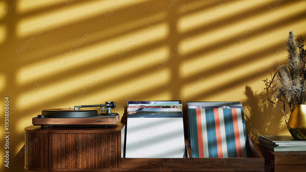 Retro interior with turntable and vinyl records on yellow wall 3D render illustration #1931808654
