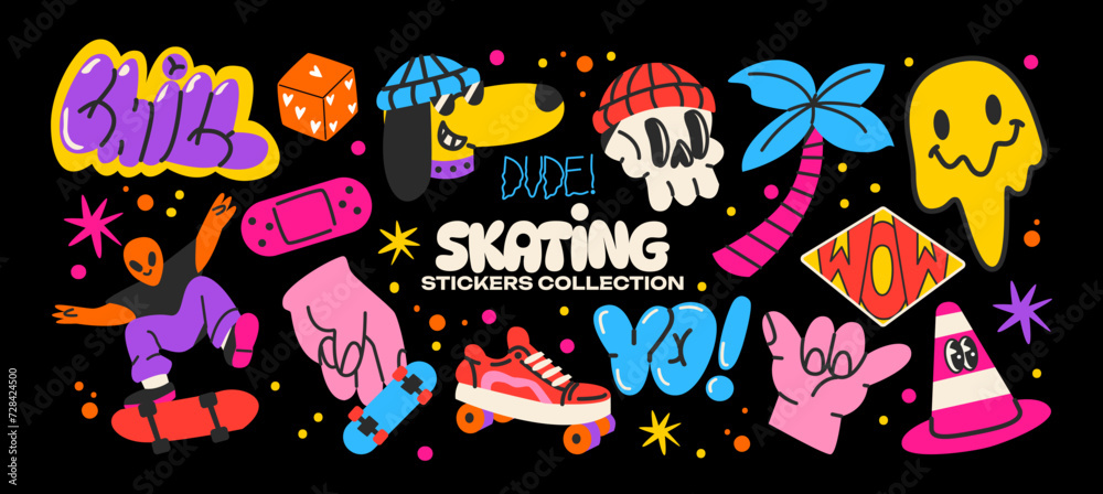 Retro skater stickers in 90s cartoon style. Skateboarding badges, rollers, vinyl, vintage, UFO. Hippie acid groovy y2k, nostalgia vector shapes #728424500